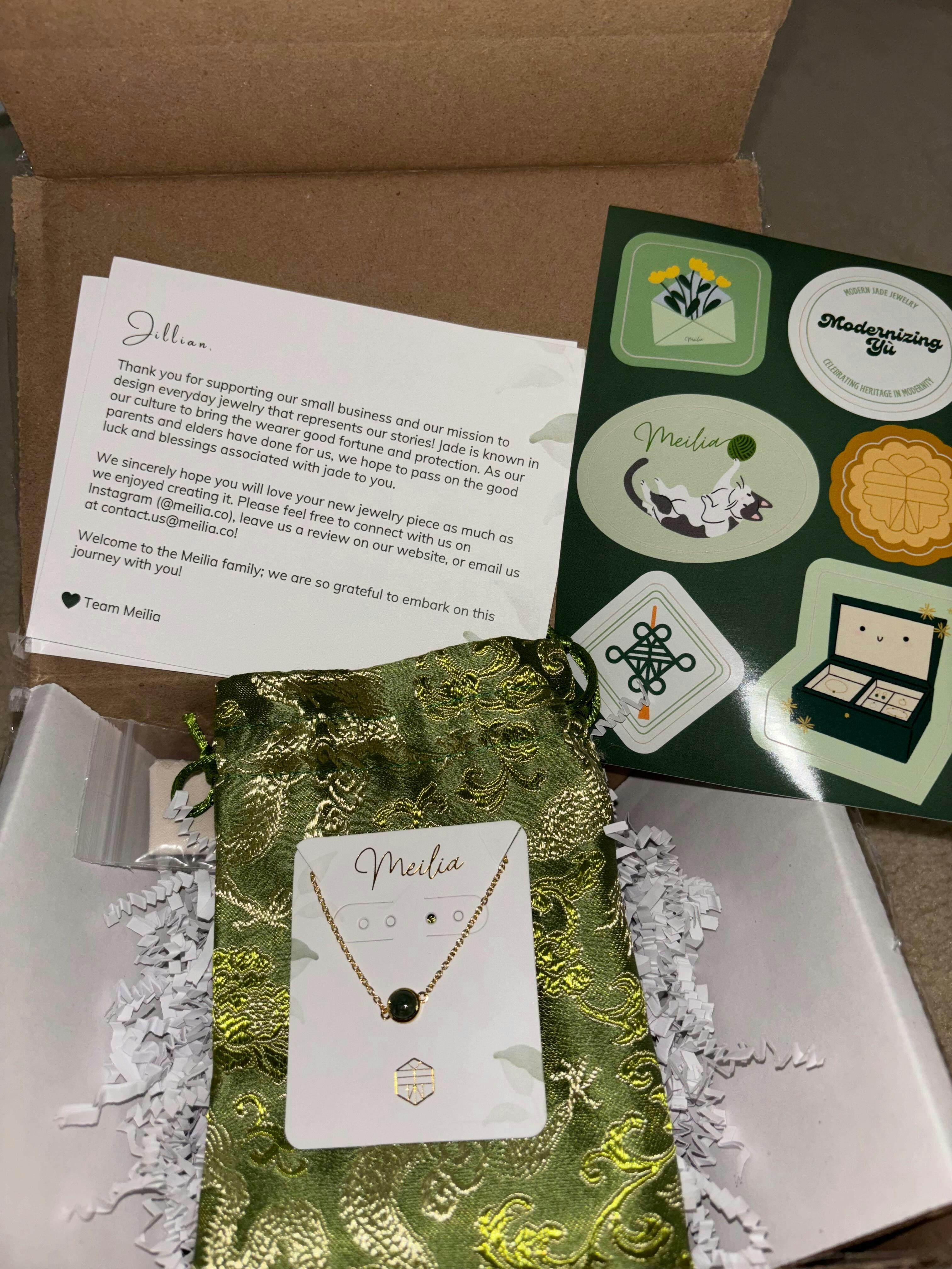 I bought this bracelet to remind me of my paternal grandparents/partial Chinese side and since I always saw my grandmother with jade bangles growing up. While researching where to find cute and modern jade jewelry I stumbled upon Meilia and really loved their story about why they started this shop. The bracelet came in perfect condition and the packaging was so personal and cute. I love the minimalist style of the bracelet and am excited to wear it and think of my grandparents and always remember that I have Chinese roots :)
